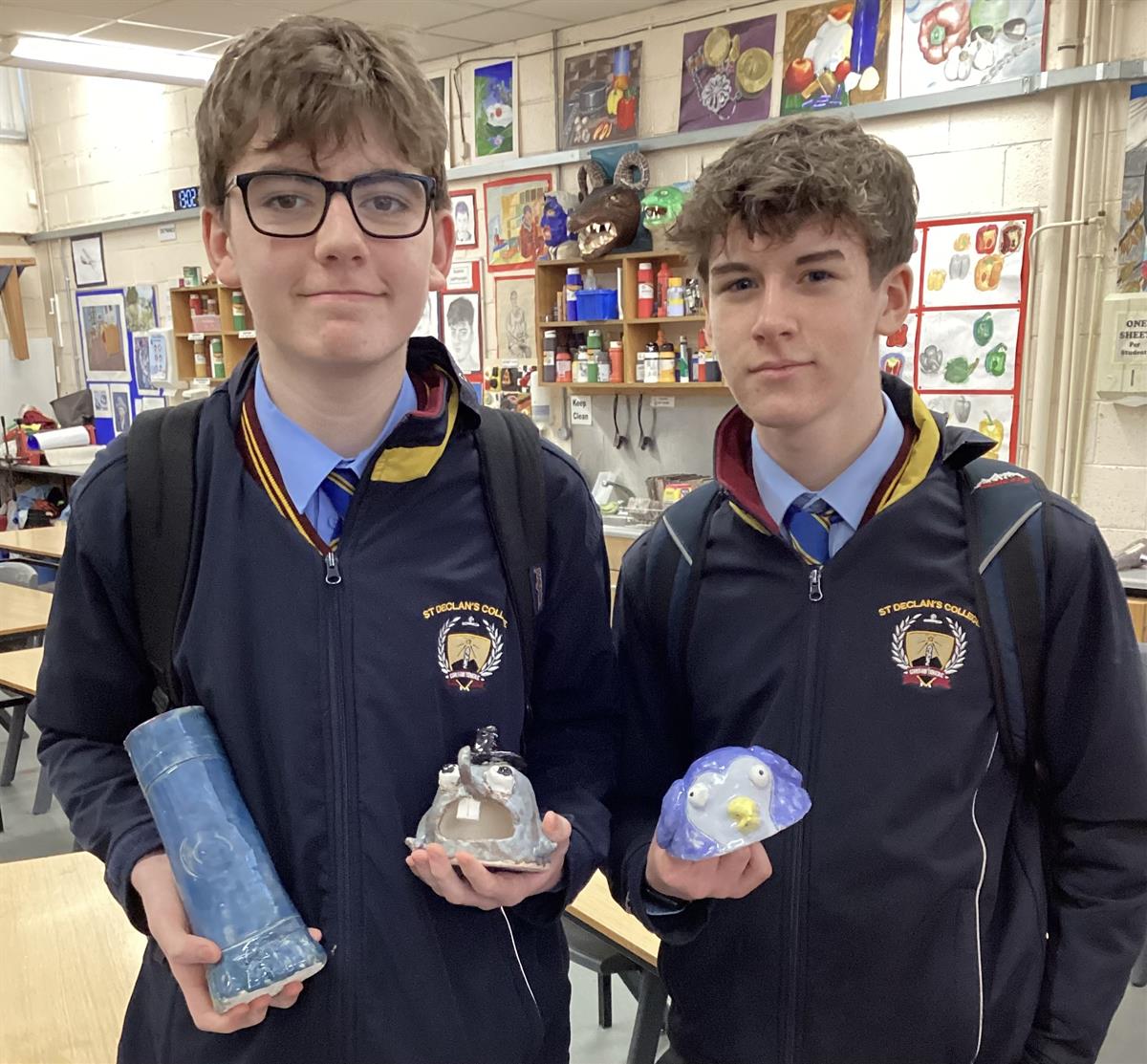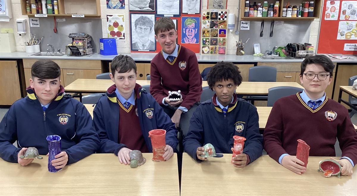 Photos of the proud 4th years with their finished pottery pieces. 4B recently learnt how to use clay and build their own finished sculptures during their pottery block in the art room. Hopefully, there will be some spaces available on the mantel piece/ shelves at home for their masterpieces! Well done boys.